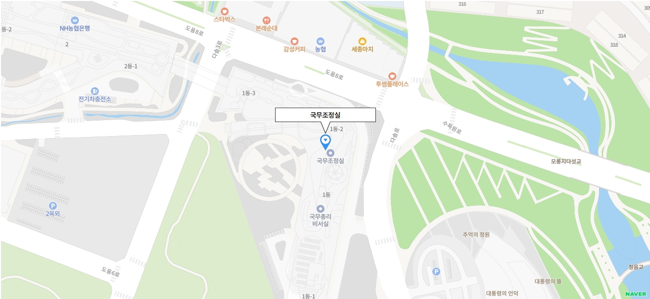 내비게이션 검색 시 "세종특별자치시 다솜로261 정부세종청사 1동"